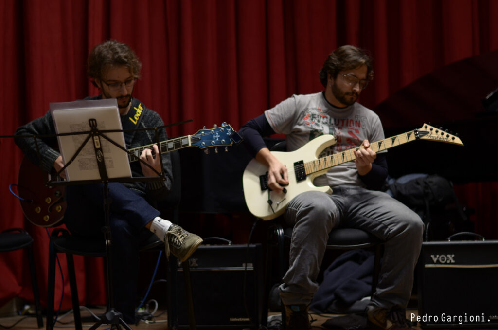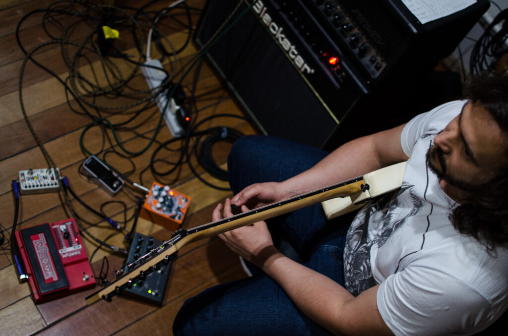 É um baita exercício de autoconhecimento e autocontrole, pois quanto menos preocupados com isso, quanto mais relaxados estamos, melhores saem os takes. Essa gravação de disco foi uma experiência bem enriquecedora por conta de tudo isso. Foi realmente uma imersão. A gente chegava por volta de 9 da manhã no estúdio, passávamos o dia lá e saíamos só de noite. E planejamos esses 9 dias de gravação pra sair com o instrumental todo gravado, pra ficarem faltando apenas os solos do Chico e as vozes. Mas não foi bem assim. Nesses dias de gravação de guitarra o tempo foi suficiente apenas pra gravar as guitarras base mais estruturais da música. Outros detalhes como melodias e efeitos acabaram tendo que ficar pra depois.
