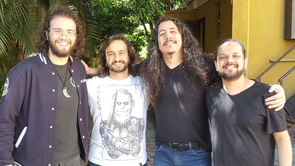 No ano de 2018 chamamos o André Brasil para trabalhar com a gente e nos ajudar com a pré-produção das músicas do disco. Nos reuníamos toda semana para discutir os arranjos das músicas, novas ideias e outros detalhes das músicas. Nesse ano trabalhamos no polimento das músicas que já estavam mais encaminhadas e na composição do zero de 3 novas músicas – Cinzas, Alma e Calvário. É muito engraçado pois os nomes dessas músicas vieram muito tempo depois. Por mais de um ano a gente se referia a elas como Balada Doom (ou Música do Chico), Pesadona e Música do Fox, respectivamente hahahah!